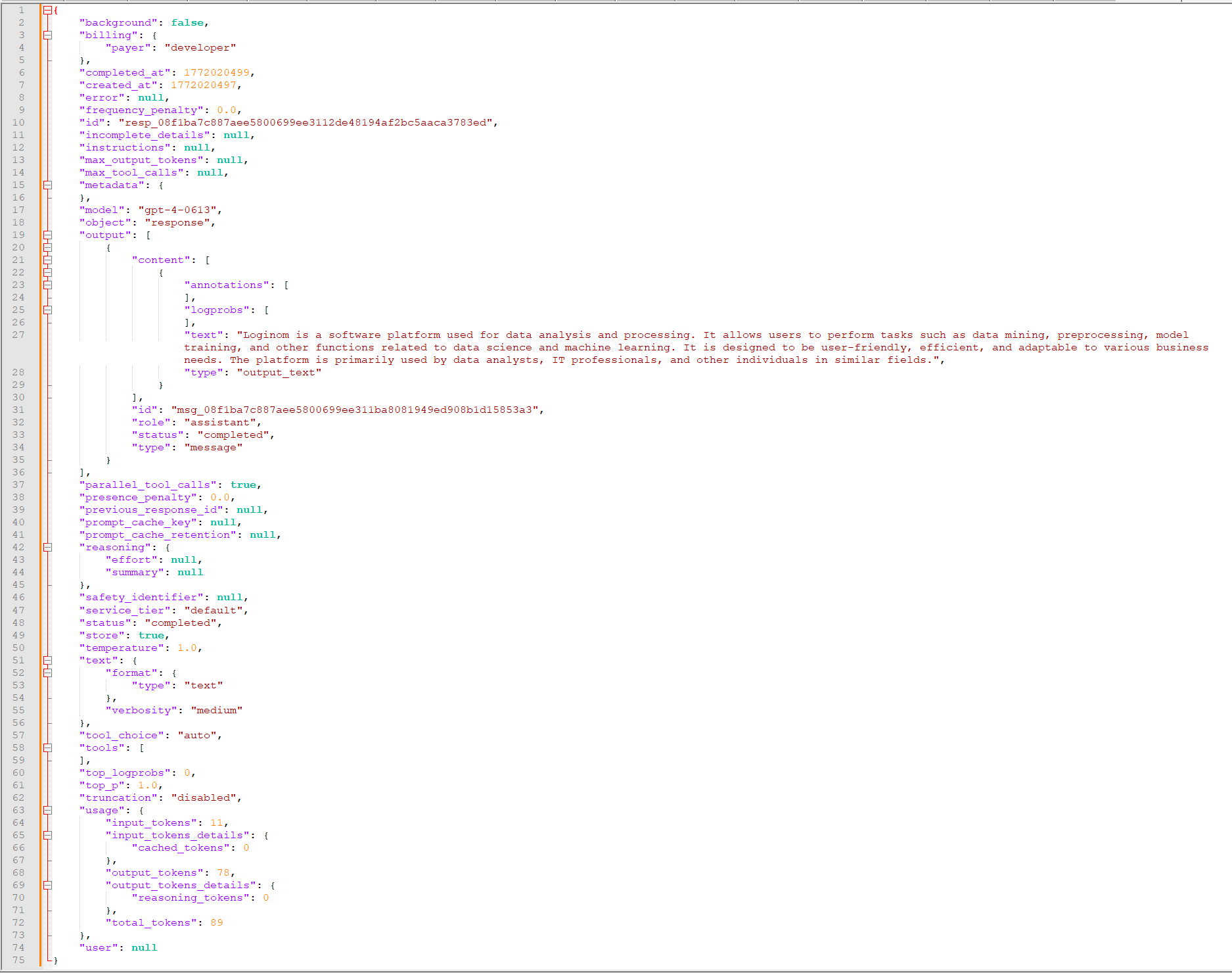 {"model": "gpt-4", "input": "What is Loginom?"}В данном примере промпт для языковой модели — '"What is Loginom?"'. Показан минимальный набор параметров, при котором Сценарий будет работать. Полный список параметров запроса можно посмотреть в официальной документации к ChatGPT.